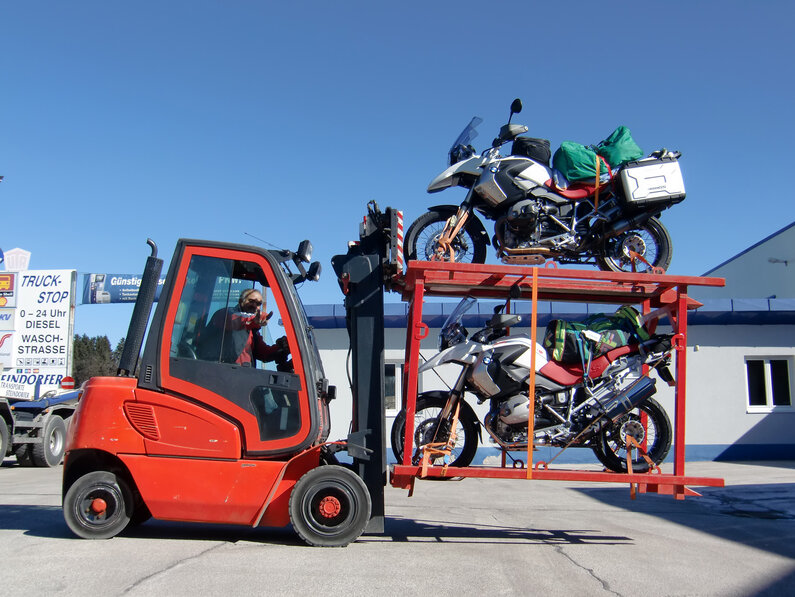 Zusätzlich zum gesamten Verladeequipment ist auch immer ein Stapler vorhanden, damit wir in der Urlaubsregion vollkommen autark sind und keine fremde Hilfe benötigen!