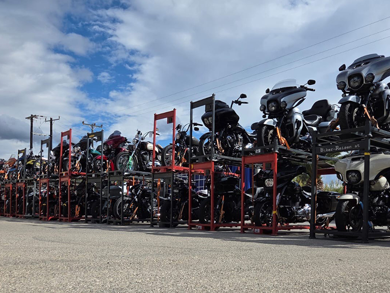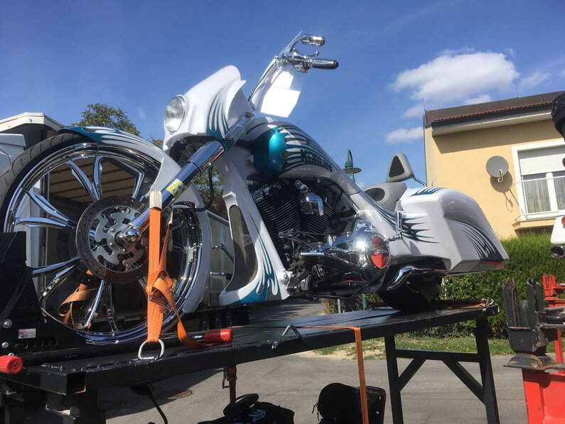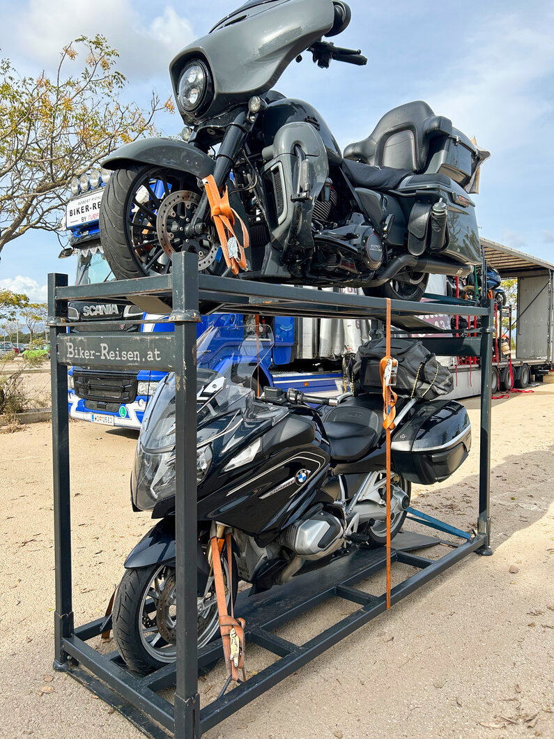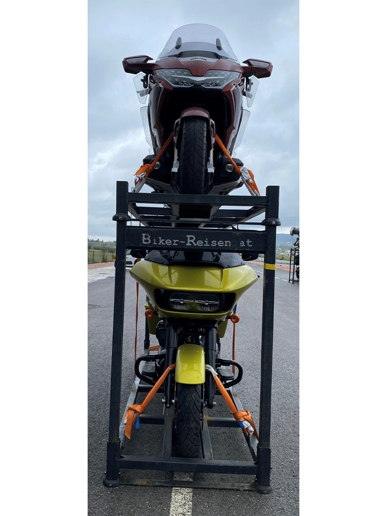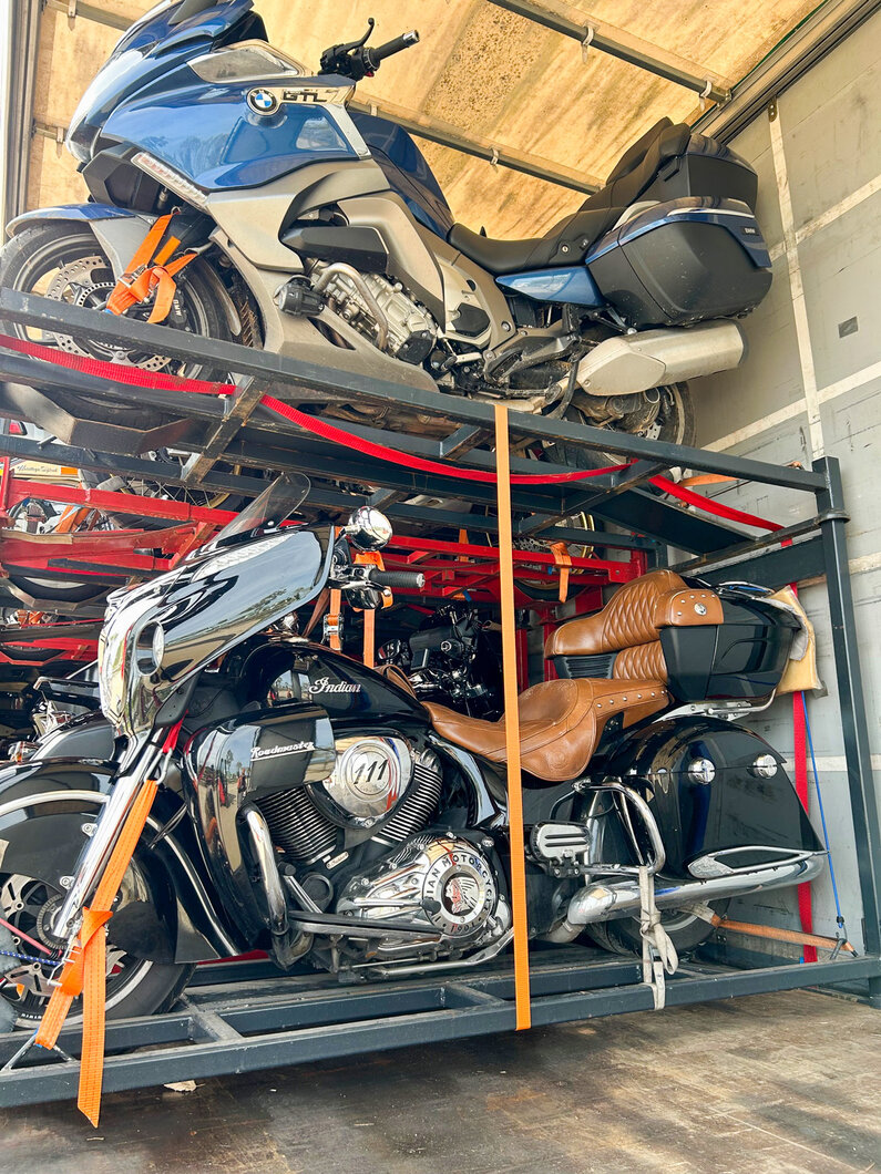 Wir haben Motorrad Boxen in verschiedenen Größen angefertigt, so dass jedes Bike sicher auf unseren Lkws verladen und transportiert werden kann.